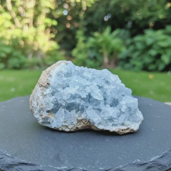 Cette Célestine bleue brute en provenance de Madagascar dévoile de magnifiques cristaux aux nuances célestes.