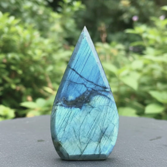 Cette flamme en Labradorite bleue, taillée et polie à la main, révèle des reflets lumineux et irisés qui changent selon l’angle de la lumière.