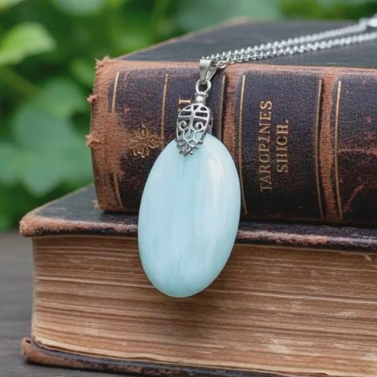 Ce pendentif ovale en Aragonite bleue, d’origine pakistanaise, séduit par sa teinte douce entre bleu ciel et turquoise, souvent marbrée de blanc.